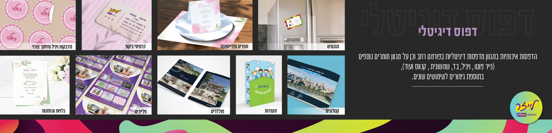 דפוס דיגיטלי איכותי – המיתוג שלכם מתחיל כאן מחלקת הדפוס הדיגיטלי של 'לייזר מכוני העתקות' היא הלב הפועם של מיתוג העסק שלכם. אנו מציעים מגוון רחב של פתרונות דפוס מתקדמים בהתאמה אישית ובאיכות ללא פשרות: מכרטיסי ביקור ופליירים שמושכים את העין, דרך פולדרים, מעטפות וגלויות מעוצבות, ועד מוצרי נייר משלימים כמו בלוקים לכתיבה, מחברות ממותגות ותעודות הוקרה. בעזרת טכנולוגיה חדישה ודיוק מקסימלי, אנו הופכים כל קובץ למוצר מוחשי מרשים, שעוזר לכם להעביר את המסר השיווקי בצורה המקצועית ביותר.